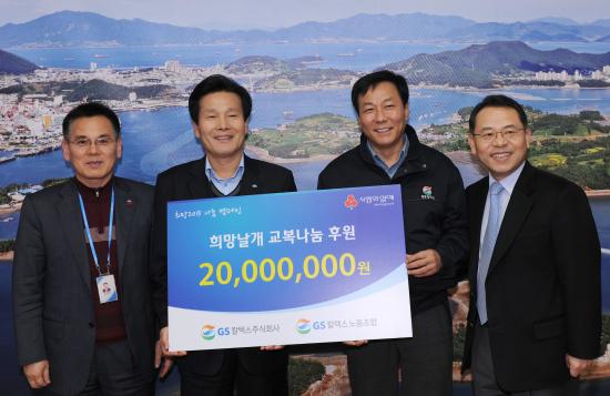 ¿©¼ö½Ã(½ÃÀå ÁÖöÇö)¿¡ µû¸£¸é 22ÀÏ ¿ÀÈÄ ¿©¼ö½Ãû ½ÃÀå½Ç¿¡¼ GSĮŨ½º ±èÇü¼ø Àü¹«¿Í ±è±¹Áø ³ëÁ¶À§¿øÀå µîÀÌ Âü¼®ÇÑ °¡¿îµ¥ ¡®Èñ¸Á³¯°³ ±³º¹³ª´®¡¯ 2000¸¸¿øÀÇ ÈÄ¿øÁõ¼ Àü´Þ½ÄÀ» °¡Á³´Ù.
