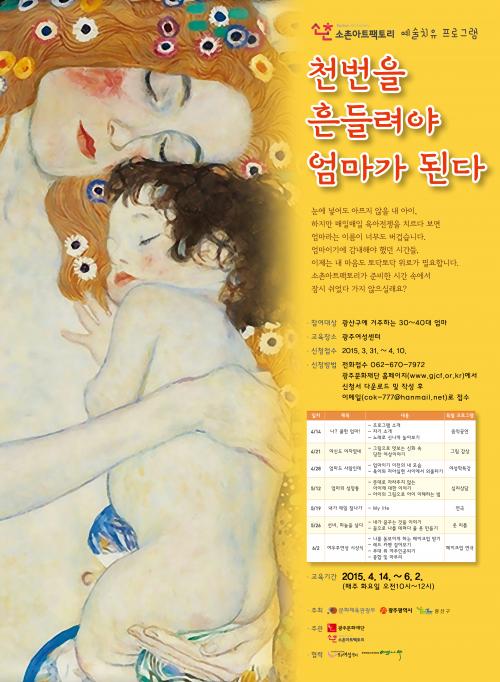 À̹ø ¡®Ãµ¹øÀ» Èçµé·Á¾ß ¾ö¸¶°¡ µÈ´Ù¡¯ÇÁ·Î±×·¥Àº ¾ö¸¶À̱⿡ °¨³»ÇØ¾ß Çß´ø ¼ø°£µéÀ» ÇÔ²² °øÀ¯Çϰí, À§·ÎÇϱâ À§ÇØ ¸¶·ÃÇÑ ¿¹¼úÄ¡À¯ ÇÁ·Î±×·¥À¸·Î 4¿ù 14ÀϺÎÅÍ 6¿ù 2ÀϱîÁö ¸ÅÁÖ È¿äÀÏ ¿ÀÀü 10½Ã¿¡ ±¤ÁÖ¿©¼º¼¾ÅÍ¿¡¼ ÁøÇàµÈ´Ù.