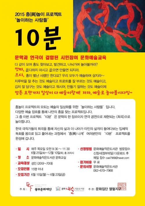 ±¤ÁÖ¹®ÈÀç´Ü(´ëÇ¥ÀÌ»ç ¼¿µÁø)Àº ¿¬±Ø°ú Èñ°îÀÛǰÀ» ¿¬°áÇÑ ¹®È¿¹¼ú±³À°ÇÁ·Î±×·¥ÀÎ ¡®2015 Èï(ýé)³îÀÌ ÇÁ·ÎÁ§Æ®_10ºÐ(ÀÌÇÏ ¡®Èï³îÀÌ¡¯)¡¯¸¦ °³¼³Çϰí ÇÁ·Î±×·¥ Âü°¡ÀÚ¸¦ ¸ðÁýÇÑ´Ù°í ¹àÇû´Ù.