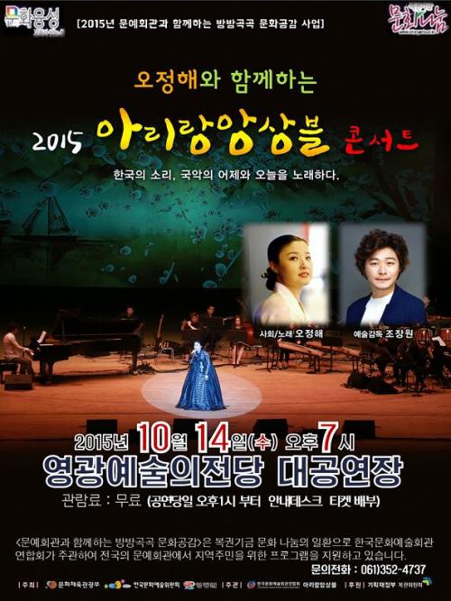 ¹®È¿¹¼ú¿å±¸ ÃæÁ· ¹× ¹®È¼öÁØ Çâ»óÀ» À§ÇØ ¸¶·ÃµÈ À̹ø °ø¿¬Àº 2015³â ¹®Èȸ°ü°ú ÇÔ²²ÇÏ´Â ¹æ¹æ°î°î ¹®È°ø°¨ ¹Î°£¿¹¼ú´Üü ¿ì¼ö°ø¿¬ À¯Ä¡»ç¾÷À¸·Î ¹®ÈüÀ°°ü±¤ºÎ, Çѱ¹¹®È¿¹¼úÀ§¿øÈ¸, ¿µ±¤±ºÀÌ ÁÖÃÖÇϰí Çѱ¹¹®È¿¹¼úȸ°ü¿¬ÇÕȸ, ¾Æ¸®¶û ¾Ó»óºíÀÌ ÁÖ°üÀ¸·Î ÁøÇàµÇ¸ç, ±âȹÀçÁ¤ºÎ º¹±ÇÀ§¿øÈ¸°¡ ÈÄ¿øÇÑ´Ù.
