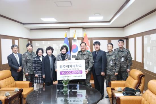 [±¤ÁÖ=¹Ìµð¾îÀü³²]¹ÚÀç¹ü ±âÀÚ=±¤ÁÖ¿©ÀÚ´ëÇб³(ÃÑÀå À̼±Àç)´Â 1¿ù 26ÀÏ(È) ¿ÀÀü 11½Ã ±¤ÁÖ Áö¿ªÀÇ ÇâÅä»ç´ÜÀÎ À°±º Á¦31º¸º´»ç´ÜÀ» ¹æ¹®ÇÏ¿© °ÇÀüÇÑ Ã¥ Àд º´¿µ ¸¸µé±â ÃßÁøÀ» À§ÇÑ µ¶¼Ä«Æä Á¶¼ºÀ» À§ÇÑ ±âºÎ±Ý Àü´Þ½ÄÀ» 31»ç´Ü º»ºÎ¿¡¼ ½Ç½ÃÇß´Ù.