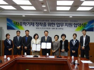 Àü³²´ëÇб³ Á¶¿µ¼ø Çй«º»ºÎÀå°ú ¿©¼ö±³À°Áö¿øÃ» ÃÖ¼º¼ö ±³À°Àå, ¿©¼öÁø·ÎüÇè ¼¾ÅÍ ÀÌ»óÈÆ ¼¾ÅÍÀåÀº 4¿ù 27ÀÏ(¼ö) ¿ÀÈÄ Àü³²´ëÇб³ ¿©¼öÄ·ÆÛ½º ´ëÇк»ºÎ 3Ãþ ¼ÒȸÀǽǿ¡¼ ¡®ÀÚÀ¯ÇбâÁ¦ Á¤ÂøÀ» À§ÇÑ ¾÷¹« Áö¿ø Çù¾à¡¯À» ü°áÇß´Ù.