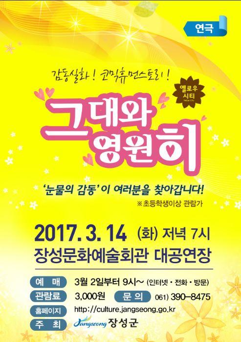 °ø¿¬ ¿¹¸Å´Â 3¿ù 2ÀÏ ¿ÀÀü9½ÃºÎÅÍ ½ÃÀ۵Ǹç ÀÎÅͳÝ(http://culture.jangseong.go.kr)°ú ÀüÈ(¢Ï 061-390-8475, 390-8476) ¶Ç´Â ¹æ¹®À» ÅëÇØ ¿¹¾à °¡´ÉÇϰí ÃʵîÇлýºÎÅÍ ¿¬·ÉÁ¦ÇÑ ¾øÀÌ ´©±¸³ª °ø¿¬À» Áñ±æ ¼ö ÀÖÀ¸¸ç °ü¶÷·á´Â 3,000¿øÀÌ´Ù.