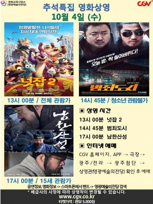 4ÀÏ(¼ö) 13½Ã¿¡´Â <³ÓÀâ2>(¾Ö´Ï¸ÅÀ̼Ç, Àüü°ü¶÷°¡), 14½Ã 45ºÐ¿¡´Â <¹üÁ˵µ½Ã>(°¨µ¶ °À±¼®, ÁÖ¿¬ ¸¶µ¿¼®¡¤À±°è»ó, û¼Ò³â°ü¶÷ºÒ°¡), 17½Ã¿¡´Â <³²Çѻ꼺>(°¨µ¶ Ȳµ¿Çõ, ÁÖ¿¬ À̺´Ç塤±èÀ±¼®¡¤¹ÚÇØÀÏ, 15¼¼°ü¶÷°¡)
