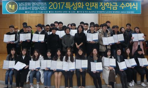 [±¤ÁÖ=¹Ìµð¾îÀü³²]¹ÚÀç¹ü ±âÀÚ=È£³²´ëÇб³ ³²µµ¹®È¿µ¾îÄÜÅÙÃ÷ÇÁ·Îµà¼¾ç¼º»ç¾÷´Ü(´ÜÀå Á¤Çà)Àº Áö³ 15ÀÏ ¿ÀÈÄ 2½Ã 4È£°ü ¼¼¹Ì³ª½Ç¿¡¼ ¡®2017³âµµ Ư¼ºÈÀÎÀç ÀåÇÐ±Ý ¼ö¿©½Ä¡¯À» °³ÃÖÇß´Ù.
