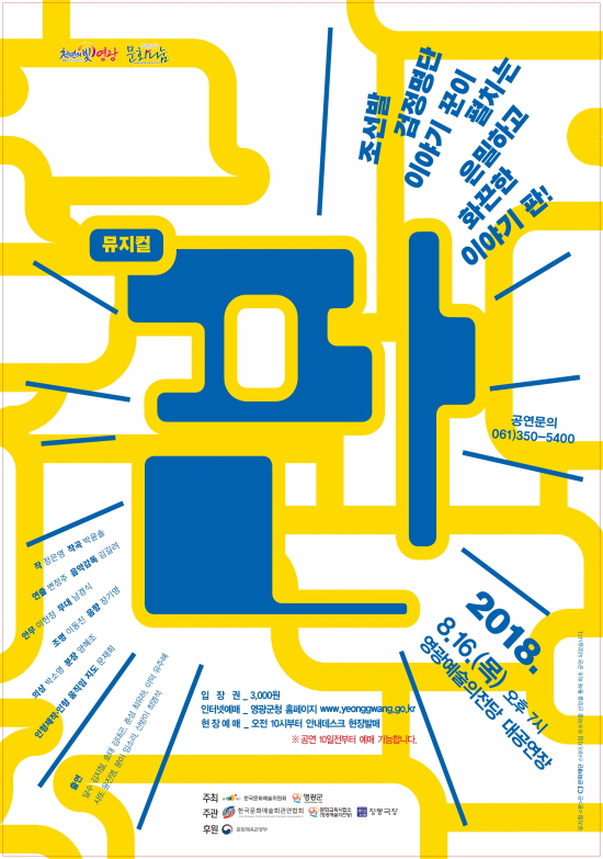 À̹ø °ø¿¬Àº Çѱ¹¹®È¿¹¼úÀ§¿øÈ¸¿Í ¿µ±¤±ºÀÌ ÁÖÃÖÇϰí Çѱ¹¹®È¿¹¼úȸ°ü¿¬ÇÕȸ¿Í ¿µ±¤¿¹¼úÀÇÀü´çÀÌ ÁÖ°üÇÏ¸ç ¹®ÈüÀ°°ü±¤ºÎ¿¡¼ ÈÄ¿øÇÑ´Ù. °ü¶÷·á´Â Àü¼® 3õ¿øÀ̸ç ÀÔÀå±ÇÀº ¿À´Â 7ÀϺÎÅÍ Æ¼ÄϸµÅ©¸¦ ÅëÇØ ÀÎÅÍ³Ý ¿¹¸Å°¡ °¡´ÉÇÏ°í ¿µ±¤¿¹¼úÀÇÀü´ç ¾È³»µ¥½ºÅ©¿¡¼ ÇöÀ忹¸Å¸¦ ½Ç½ÃÇÑ´Ù. ÀÎÅͳݿ¹¸Å³ª ÇöÀ广¹®ÀÌ ¾î·Á¿î 65¼¼ÀÌ»ó ¾î¸£½ÅµéÀº ¿µ±¤¿¹¼úÀÇÀü´ç¿¡¼ ÁÖ°üÇÏ´Â ÀüÈ¿¹¸Å(061-350-5400) ¼ºñ½º¸¦ ÀÌ¿ëÇÏ¿© ¿¹¸Å°¡ °¡´ÉÇÏ´Ù. ±âŸ ÀÚ¼¼ÇÑ Á¤º¸´Â ¿µ±¤¿¹¼úÀÇÀü´ç ȨÆäÀÌÁö(art.yeonggwang.go.kr)¿¡¼ È®ÀÎÇÒ ¼ö ÀÖ´Ù.