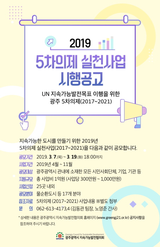 [NGO=¹Ìµð¾îÀü³²=À±¹ÌÇý ±âÀÚ=±¤ÁÖ½Ã¿Í ±¤ÁÖ±¤¿ª½ÃÁö¼Ó°¡´É¹ßÀüÇùÀÇȸ(ÀÌÇÏ ÇùÀÇȸ)´Â ¿À´Â 19ÀϱîÁö ¡®2019³â 5Â÷ÀÇÁ¦ ½Çõ»ç¾÷¡¯À» °ø¸ðÇÑ´Ù.