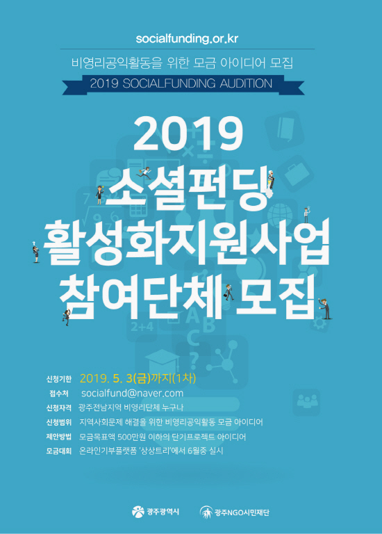 (»ç)±¤ÁÖNGO½Ã¹ÎÀç´Ü(ÀÌ»çÀå ·ùÇÑÈ£)Àº ¿À´Â 5¿ù 3ÀϱîÁö Áö¿ªºñ¿µ¸®´Üü¸¦ ´ë»óÀ¸·Î ¡®2019 ¼Ò¼ÈÆÝµùȰ¼ºÈÁö¿ø»ç¾÷¡¯À» ¸ðÁýÇÑ´Ù°í ¹àÇû´Ù.