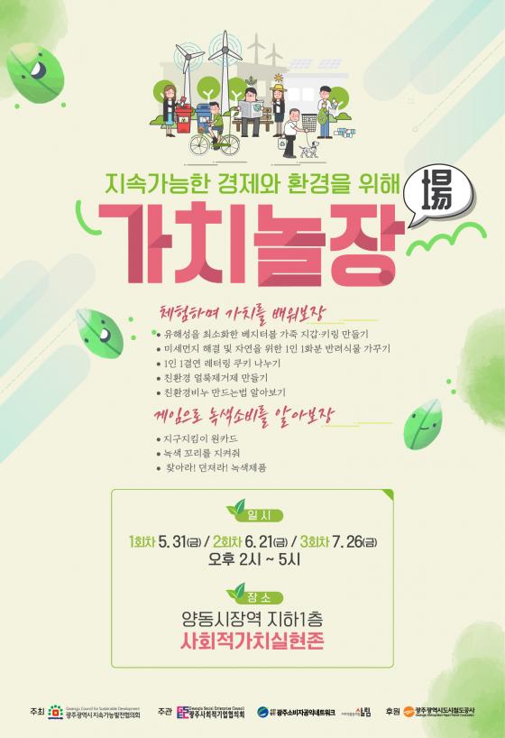 °¡Ä¡³îÀåÀº Áö¼Ó°¡´ÉÇѵµ½Ã ±¤ÁÖ¸¦ ¸¸µé±â À§ÇÑ 5Â÷ÀÇÁ¦ ½Çõ»ç¾÷À¸·Î »çȸÀû°æÁ¦¡¤³ì»ö±â¾÷ÀÇ °¡Ä¡¸¦ ¾Ë¸®°í üÇèÇÏ´Â ÇÁ·Î±×·¥ÀÌ´Ù. 5¿ù 31, 6¿ù 21, 7¿ù 26ÀÏ ÃÑ 3ȸ ÁøÇàµÇ¸ç 14½ÃºÎÅÍ 17½Ã±îÁö ¿î¿µÇÑ´Ù.