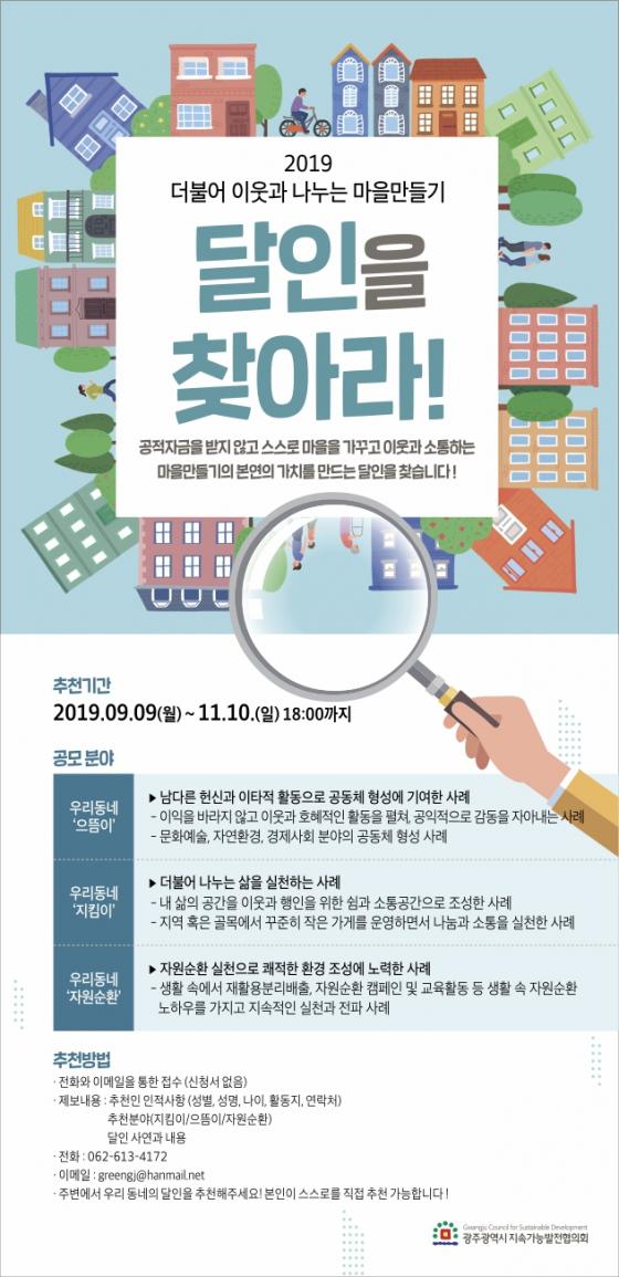[±¤ÁÖ=¹Ìµð¾îÀü³²]À±¹ÌÇý ±âÀÚ=±¤ÁÖ±¤¿ª½ÃÁö¼Ó°¡´É¹ßÀüÇùÀÇȸ(ÀÌÇÏ ÇùÀÇȸ)´Â 2019³â ´õºÒ¾î ³ª´©´Â ¸¶À» ¸¸µé±â ¡®´ÞÀÎÀ» ã¾Æ¶ó¡¯ °ø¸ð»ç¾÷À» 9¿ù 9ÀϺÎÅÍ 11¿ù10ÀϱîÁö 64Àϰ£ ÁøÇàµÈ´Ù°í ¹àÇû´Ù.