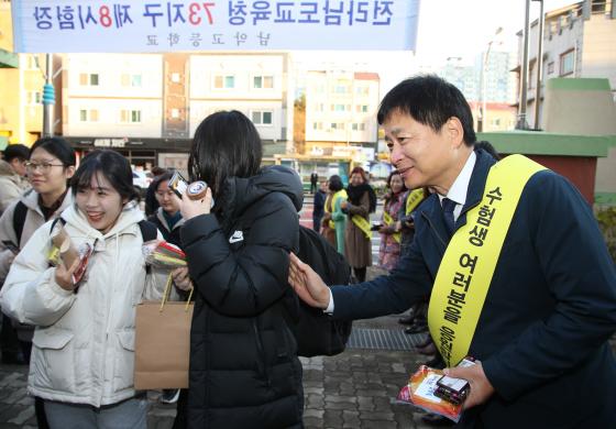 Àå¼®¿õ ±³À°°¨Àº À̳¯ ¿ÀÀü ¹«¾È±º »ïÇâÀ¾ ³²¾Ç°íµîÇб³(73Áö±¸ Á¦8½ÃÇèÀå) Á¤¹®¿¡¼ ½ÃÇèÀ» Ä¡¸£±â À§ÇØ Çб³ ¾ÈÀ¸·Î µé¾î¼´Â ¼öÇè»ýµéÀ» µû¶æÇÏ°Ô ¸ÂÀÌÇϸç ÃÖ¼±À» ´ÙÇØÁÙ °ÍÀ» ´çºÎÇß´Ù.