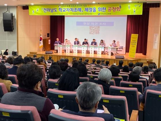 Àü¶ó³²µµ±³À°Ã»(±³À°°¨ Àå¼®¿õ)ÀÌ Àü¶ó³²µµ Çб³ÀÚÄ¡Á¶·Ê Á¦Á¤¿¡ ´ëÇÑ °ø°¨´ë¸¦ È®»êÇÏ°í ±³À°°øµ¿Ã¼ÀÇ ´Ù¾çÇÑ ÀǰßÀ» ¼ö·ÅÇÑ Çб³ÀÚÄ¡Á¶·Ê¾ÈÀ» ¸¶·ÃÇϱâ À§ÇØ Áö³´Þ 29ÀÏ ¿ÀÈÄ Àü³²¿©¼º°¡Á·Àç´Ü¿¡¼ Çлý, ±³Á÷¿ø, Çкθðµî 300¿© ¸íÀÌ Âü¼®ÇÑ °¡¿îµ¥ °øÃ»È¸¸¦ °³ÃÖÇß´Ù.