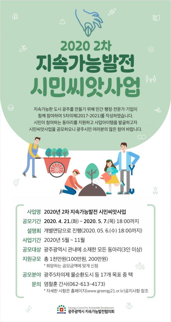 [¹Ìµð¾îÀü³² À±¹ÌÇý ±âÀÚ] ±¤ÁÖ±¤¿ª½Ã¿Í ±¤ÁÖÁö¼Ó°¡´É¹ßÀüÇùÀÇȸ(ÀÌÇÏ ÇùÀÇȸ)´Â 21ÀϺÎÅÍ 5¿ù 7ÀϱîÁö ¡®2020³â 2Â÷ Áö¼Ó°¡´ÉÇÑ ½Ã¹Î¾¾¾Ñ»ç¾÷¡¯ Àç°ø¸ð¸¦ ½ÃÇàÇÑ´Ù.