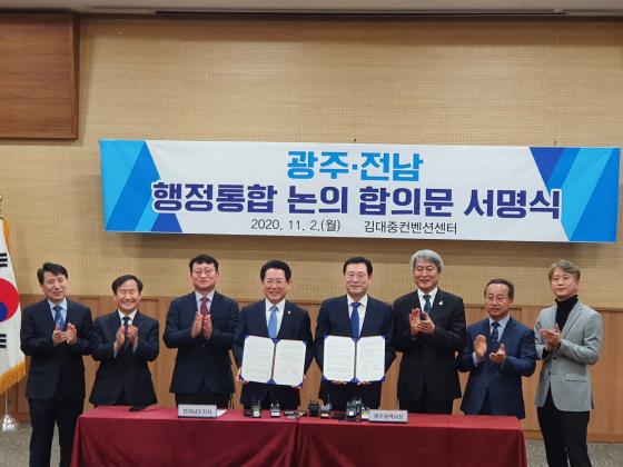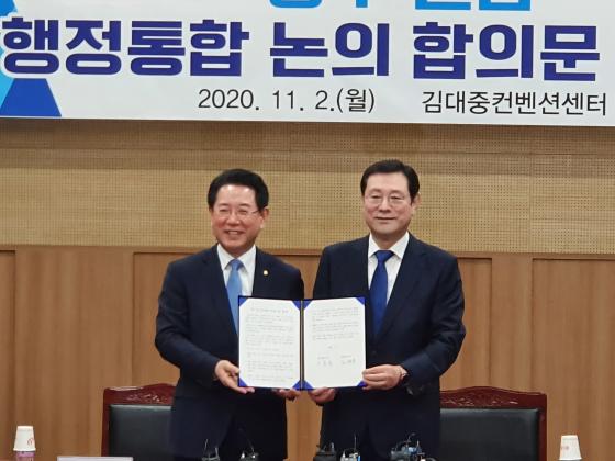 À̿뼷 ±¤ÁÖ½ÃÀåÀº "ÅëÇÕ¿¡ ´ëÇÑ ½ÃµµÁö»ç°£ ÇÕÀÇ´Â »õ ½Ã´ë¸¦ ¿©´Â ¸Å¿ì ÀǹÌÀִ ù°ÉÀ½ÀÌ´Ù" ¸ç "±¤ÁÖÀü³²ÀÇ ¹Ì·¡°¡ ´Þ·ÁÀÖ´Ù´Â ½Ã´ëÀû ¼Ò¸íÀǽÄÀ» °®°í »ó»ý°ú µ¿¹Ý ¼ºÀå¿¡ ¸ðµç ³ë·ÂÀ» ´ÙÇØ ÇàÁ¤ÅëÇÕÀ» ¹Ýµå½Ã ÀÌ·ï³»°Ú´Ù"°í ¸ñ¼Ò¸®¿¡ ÈûÀ» Áá´Ù.
