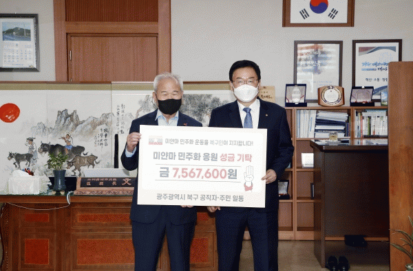 ºÏ±¸´Â 41³â Àü ¿À¿ù ±¤ÁÖ¸¦ ¶°¿Ã¸®°Ô ÇÏ´Â ¹Ì¾á¸¶ÀÇ ¹ÎÁÖȿÀ» ÀÀ¿øÇϰíÀÚ ¸ð±ÝȰµ¿À» ÆîÃÆÀ¸¸ç ºÏ±¸ °øÁ÷ÀÚ 505¸¸¿ø, ºÏ±¸ ÁÖ¹ÎÀÚÄ¡À§¿øÀå´ÜÇùÀÇȸ 145¸¸¿ø, Àϰ ÁÖ¹ÎÀÚÄ¡À§¿øÈ¸ 51¸¸ 8õ ¿ø, °ø¹«¿ø³ëÁ¶ ±¤Áֺϱ¸ÁöºÎ°¡ 51¸¸ 8õ ¿øÀ» ¸ð¾Ò´Ù.