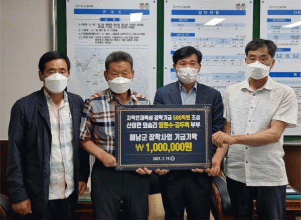 »êÀÌ¸é ¿Ü¼Û¸® ÀÓÈͼö¡¤±èµÎ¿Á ºÎºÎ´Â 19ÀÏ ÇØ³²±º ÀåÇлç¾÷±â±ÝÀ¸·Î 100¸¸¿øÀ» ±âŹÇß´Ù.