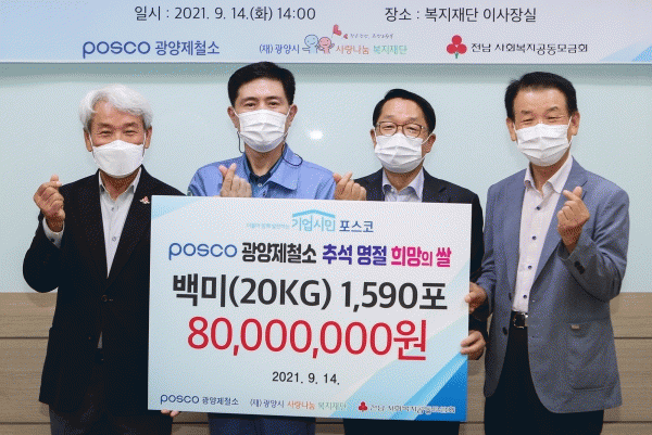 [¹Ìµð¾îÀü³² ÀÓ¼º¿Ï ±âÀÚ] Æ÷½ºÄÚ ±¤¾çÁ¦Ã¶¼Ò´Â Áö³ 14ÀÏ 2021³â Ãß¼® ¸íÀý ¡®Èñ¸ÁÀÇ ½Ò¡¯ Àü´Þ½ÄÀ» º¹ÁöÀç´Ü¿¡¼ °®°í Áö¿ª»çȸ ÀÌ¿ôÀ» À§ÇØ 8õ¸¸¿ø »ó´çÀÇ ¹é¹Ì 20kg 1,590Æ÷´ë¸¦ ±¤¾ç½Ã»ç¶û³ª´®º¹ÁöÀç´Ü¿¡ Àü´ÞÇß´Ù.