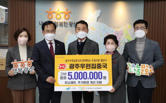 [¹Ìµð¾îÀü³² Á¦°¥´ëÁ¾ ±âÀÚ] ±¤ÁÖ¿ìÆíÁýÁß±¹(±¹Àå ±èÁ¾¸í)Àº Áö³ 23ÀÏ ¿¬¸»À» ¸Â¾Æ ±¤ÁÖ ±¤»ê±¸Ã»À» ¹æ¹®ÇØ ¹è·Á°èÃþ Áö¿øÀ» À§ÇÑ 500¸¸¿ø »ó´çÀÇ ÈÄ¿ø¹°Ç°À» Àü´ÞÇß´Ù.