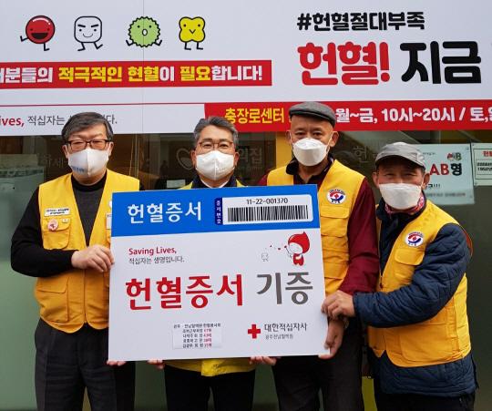 À̵éÀº ´ëÇÑÀû½ÊÀÚ»ç ±¤ÁÖÀü³²Ç÷¾×¿øÇåÇ÷ºÀ»çȸ·Î Áö³ 1ÀÏ ÇåÇ÷ÀÇÁý ÃæÀå·Î¼¾ÅÍ¿¡¼ ³ª´öÁÖ È¸À塤Á¶ºÎ±Ù ºÎȸÀ塤À±Á¾Ã¤ °í¹®¡¤±è±¤ÁÖ È¸¿ø µî 4¸íÀÌ ÇåÇ÷ÇÏ°í ¹Þ¾Ò´ø ÇåÇ÷Áõ¼ 164¸Å¸¦ ÀÀ±ÞȯÀÚ¿Í ¹éÇ÷º´¡¤¾Ï¡¤Èñ±Í ÁúȯÀÚµéÀ» À§ÇØ ½á´Þ¶ó¸ç ±¤ÁÖÀü³²Ç÷¾×¿ø¿¡ ±âºÎÇß´Ù°í 2ÀÏ ¹àÇû´Ù. À̾î Äڷγª19 Àå±âÈ·Î ÀÎÇÑ Ç÷¾× ºÎÁ· ÇØ°á¿¡ ÈûÀ» º¸Å±â À§ÇØ ÃæÀå·Î ÀÏ¿øÀ» µ¹¸ç ¡®»ý¸í³ª´® ÇåÇ÷ Ä·ÆäÀΡ¯À» ½Ç½ÃÇϰí ÁÖº¯¿¡ µ¿ÂüÀ» È£¼ÒÇß´Ù.