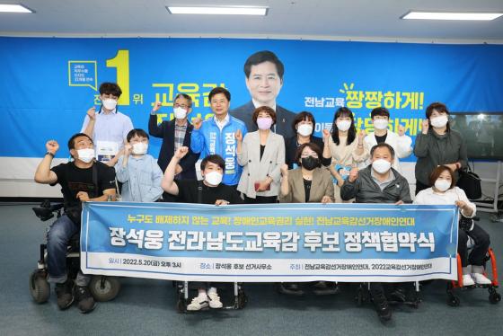 Áö³ 20ÀÏ¡®Àü³²±³À°°¨¼±°ÅÀå¾ÖÀο¬´ë¡¯´Â Àå¼®¿õ Èĺ¸ ¼±°Å»ç¹«¼Ò¿¡¼ Á¤Ã¥Çù¾àÀ» ¸Î¾ú´Ù. ¡®Àü³²±³À°°¨¼±°ÅÀå¾ÖÀο¬´ë¡¯ °ü°èÀÚ´Â ¡°Áö³ 4³â µ¿¾È Àå¼®¿õ ±³À°°¨Àº Àå¾ÖÀÎ ±³À°±ÇÀ» º¸ÀåÇϱâ À§ÇØ ³ë·ÂÇØ ¿Ô°í, Àå¾ÖÀε鿡°Ô ±³À°ÀÇ ¹Ì·¡°¡ ÀÖÀ½À» º¸¿©Áá´Ù¡±¸ç ¡°Çù·Â°ú °ø»ýÀ» ÅëÇØ Àå¾ÖÀÎÀÇ ±³À°¹ÞÀ» ±Ç¸®°¡ º¸ÀåµÇ´Â Àü³²±³À°À» ¸¸µé¾î¿Â Àå¼®¿õ È常¦ ÁöÁöÇÑ´Ù¡±°í ¹àÇû´Ù.