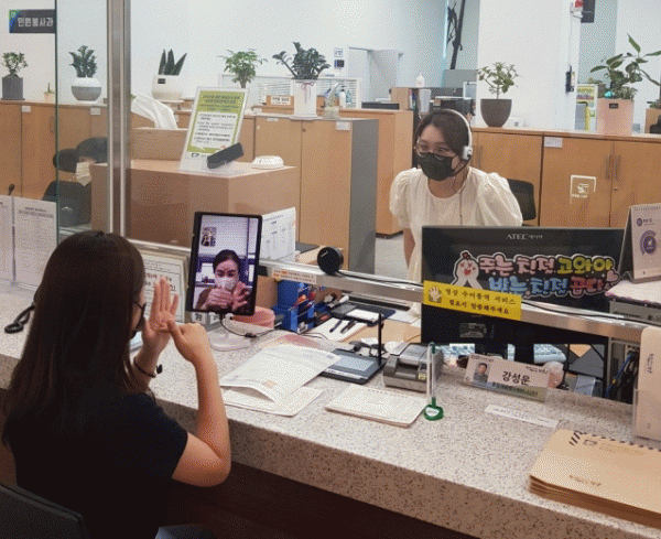 ¸ÕÀú Á¾Çչοø½ÇÀ» ¹æ¹®ÇÑ Àå¾ÖÀÎ ¹Î¿øÀÎÀÌ ¼ö¾î Å뿪 ¼ºñ½º Áö¿øÀ» ¿äûÇÏ¸é ±¤Áֽà Àå¾ÖÀÎÁ¾ÇÕº¹Áö°ü Å뿪»ç¿Í ¹Î¿øÀΰ£ ½Ç½Ã°£ ¿µ»ó ¼ö¾î Å뿪ÀÌ ÀÌ·ïÁö¸ç ¼ö¾î Å뿪ÀÌ ¿Ï·áµÇ¸é Å뿪»ç°¡ ´ã´ç °ø¹«¿ø¿¡°Ô ¹Î¿ø ³»¿ëÀ» Áï°¢ Àü´ÞÇÏ´Â ±¸Á¶ÀÌ´Ù.