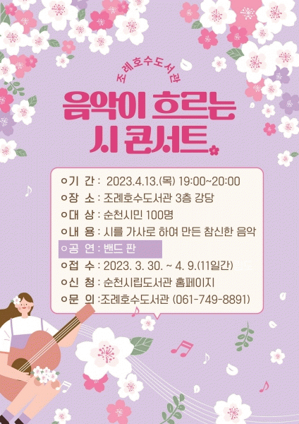 [¹Ìµð¾îÀü³² ÃÖ¶õÈñ ±âÀÚ] ¼øÃµ½Ã¸³Á¶·ÊÈ£¼öµµ¼°üÀº ¿À´Â 13ÀÏ ¿ÀÈÄ 19½Ã Á¶·ÊÈ£¼öµµ¼°ü °´ç¿¡¼¡®À½¾ÇÀÌ È帣´Â ½Ã ÄܼƮ¡¯¸¦ ÁÖÁ¦·Î °ø¿¬À» ¿¬´Ù.