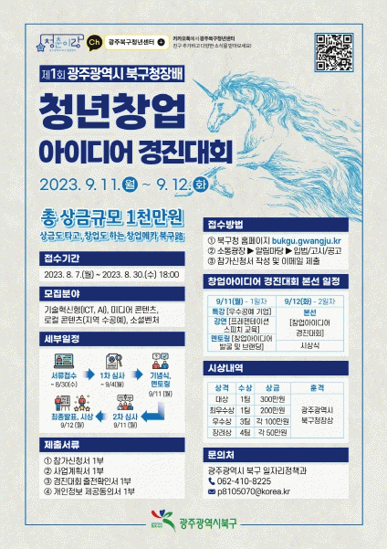ºÏ±¸ÀÇ 2023³âµµ ½Å±Ô ½ÃÃ¥ÀΠû³ââ¾÷ ¾ÆÀ̵ð¾î °æÁø´ëȸ´Â Áö¿ªÀÇ ¹Ì·¡¸¦ À̲ø¾î°¥ Áö¿ª û³âµéÀÇ Âü½ÅÇÑ ¾ÆÀ̵ð¾î ¹ß±¼À» ÅëÇØ û³ââ¾÷ ºÕ Á¶¼º°ú »çȸÀû°æÁ¦ Àúº¯È®´ë¸¦ À§ÇØ ¸¶·ÃµÆ´Ù.
