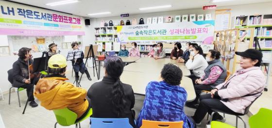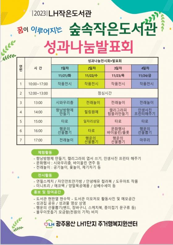 Áö³ 21ÀϺÎÅÍ 24ÀϱîÁö 4Àϵ¿¾È ±¤ÁÖ¿ë»êLH1´ÜÁö ½£¼ÓÀÛÀºµµ¼°ü¿¡¼ Áֹεé°ú ÇÔ²² ͏®±×¶óÇÇ, ¿¬ÇʽºÄÉÄ¡, Èú¸µ¿ø¿¹, ½Ã¿ÍÀ½¾Ç, ¿¡Äڹ鸸µé±â, Ã¥°ú ÇÔ²² Çϴ õ¿¬¼¼Á¦¿Í õ¿¬¼ö¼¼¹Ì ¸¸µé±â, ¸¶À½ÅÍÄ¡ µ¿È±¸¿¬, ¶±ÄÉÀÌÅ© ¸¸µé±â, ÀÚÀÌ¾ðÆ® ¾á °¡¹æ ¸¸µé±â, ¾È³çÇØU? ¾ÆÆÄÆ®, ¸¶À»°Á µî ´Ù¾çÇÑ µ¶¼, ¹®È¿¹¼ú, Ãë¹Ì, Àڱⰳ¹ß, ±³À° ÇÁ·Î±×·¥À» ÅëÇØ ¸¸³ª°í ¼ÒÅëÇß´ø °¡Àå ¶æ±í¾ú´ø ÇÑÇØ·Î ÁֹεéÀÌ Á÷Á¢ ¸¸µç ÀÛǰÀ» Àü½ÃÇϰí ÁֹεéÀÇ ¸ð½ÀÀ» ´ãÀº µ¿¿µ»ó°ú ¼º°úÁýÀ» Á¦ÀÛÇÏ¿© ÇÔ²² °øÀ¯ÇÏ°í ½Ã¿Í¿ì¸®Ãã, ¹ÙÀ̿ø°¿¬ÁÖ °ø¿¬°ú Çâ³¶ÁÖ¸Ó´Ï ¸¸µé±â, Àü·¡³îÀÌ, Ÿ·Î»ó´ã, Æ÷ÅäÁ¸ µî ´Ù¾çÇÑ Ã¼Çè°ú ÇÔ²² ¼ºÈ²¸®¿¡ ¼º°ú³ª´®¹ßǥȸ¸¦ ÁøÇàÇß´Ù.