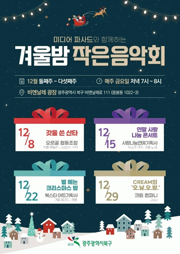 Å©¸®½º¸¶½º, °Ü¿ï dz°æ ¼ÒÀçÀÇ ¹Ìµð¾îÆÄ»çµå ¿µ»óÀÛǰ°ú ÇÔ²² ¿¸®´Â À̹ø À½¾Çȸ¿¡¼´Â 12¿ù ¸¶Áö¸· ÁÖ±îÁö ¸ÅÁÖ ±Ý¿äÀÏ Àú³á 7½ÃºÎÅÍ 1½Ã°£ µ¿¾È Áö¿ª ¿¹¼ú´ÜüÀÇ °Ü¿ï °¨¼ºÀ» ÀÚ±ØÇÏ´Â À½¾Ç°ú ¾Æ¸§´Ù¿î ¹Ìµð¾îÆÄ»çµå ºûÀÇ Ç⿬ÀÌ ÆîÃÄÁø´Ù.