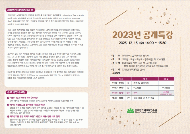 11ÀÏ ±³À°¿¬¼ö¿ø¿¡ µû¸£¸é À̹ø Ư°Àº ±è°æÀÏ ¾ÆÁÖ´ëÇб³ ½É¸®Çаú ±³¼ö¸¦ ÃʺùÇØ ÀÌ·ïÁ³´Ù. ¡®4Â÷ »ê¾÷Çõ¸í ½Ã´ë¿¡ ¿ì¸®°¡ °¡Á®¾ß ÇÒ ÁöÀû ´É·ÂÀº ¾î¶² °ÍÀΰ¡?¡¯¶ó´Â ¹°À½À» ½ÃÀÛÀ¸·Î ¾ÆÀ̵鿡°Ô ÇÊ¿äÇÑ ÁöÇý·Î¿î ¹Ì·¡±³À°¿¡ ´ëÇØ °ÀÇÇÒ ¿¹Á¤ÀÌ´Ù.