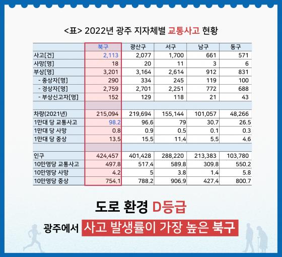 ºÏ±¸´Â °í·É Àα¸ ÁְźñÀ²ÀÌ ´Ù¸¥ Áö¿ª¿¡ ºñÇØ ¿ùµîÈ÷ ³ôÀº Áö¿ªÀÌ´Ù. ƯÈ÷ 65¼¼ ÀÌ»ó ¾î¸£½Å ±³Åë»ç°íÀ²ÀÌ Å¸ Áö¿ªº¸´Ù »ó´ëÀûÀ¸·Î ³ô´Ù. ±¤ÁÖ ÁöÀÚüº° ±³Åë»ç°í ÇöȲÀ» ³ªÅ¸³½ Åë°è¿¡ µû¸£¸é ±¤ÁÖ ºÏ±¸´Â 5°³ ÀÚÄ¡±¸ Áß Â÷·® 1¸¸´ë ´ç ±³Åë»ç°í ÃÖ´Ù, ±³Åë¾ÈÀüÁö¼ö Æò°¡ ÃÖÇÏÀ§ ¼öÁØÀÎ Dµî±ÞÀ̶õ ¼ºÀûÇ¥¸¦ ¹ÞÀº ¹Ù ÀÖ´Ù. À̰ÍÀÌ ºÏ±¸ ¾Õ¿¡ ³õÀÎ ÇØ°á ù ¹øÂ° ¸ñÇ¥·Î ±³Åë Á¤Ã¼ ÇØ¼Ò¿Í »ç°íÀ² Á¦·ÎÈ °ø¾àÀ» ¿Ï·áÇØ ¾ÈÀü º¸Çàȯ°æ È®º¸´Â Á¤ÁØÈ£ È帰¡ Ç®°íÀÚ ÇÑ ¼÷Á¦ Áß ±× ù ¹øÂ°¶ó ÇÒ ¼ö ÀÖ´Ù.