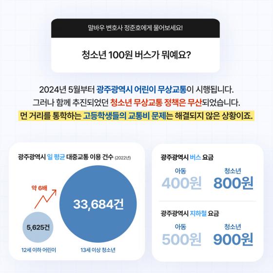 Áö³ÇØ 11¿ù, ±¤Áֽð¡ ¿ÃÇØ 5¿ùºÎÅÍ ½ÃÇàµÇ´Â ¾î¸°ÀÌ ¹«»ó±³ÅëÀÌ¿ë µµÀÔÀ» ¹ßÇ¥ÇßÁö¸¸ ÇýÅÃÀÌ ´õ Àý½ÇÇÑ Áß¡¤°íµîÇлýÀº ´ë»ó¿¡¼ Á¦¿ÜµÅ ¹ÝÂÊÂ¥¸® Á¤Ã¥À̶ó´Â ¾ð·ÐÀÇ ¹®Á¦ Á¦±â¸¦ ¹ÞÀº ¹Ù ÀÖ´Ù. 2022³â ±âÁØ ±¤Áֽà 12¼¼ ÀÌÇÏ ¾î¸°À̵éÀÇ ÀÏ Æò±Õ ´ëÁß±³Åë ÀÌ¿ë °ÇÀÌ 5,625°Ç, 13¼¼ ÀÌ»ó û¼Ò³âÀº 33,684°ÇÀ¸·Î ¾ÐµµÀûÀ¸·Î ³ô±â ¶§¹®ÀÌ´Ù. ¶ÇÇÑ ÇöÇà ±¤ÁÖ±¤¿ª½Ã ¹ö½º¿ä±ÝÀº ±³ÅëÄ«µå ÀÌ¿ë ½Ã Ã»¼Ò³âÀº 800¿ø, ¾î¸°ÀÌ´Â 400¿øÀ¸·Î û¼Ò³âÀÇ ±³Åëºñ ºÎ´ãÀÌ ÈξÀ Å©´Ù.