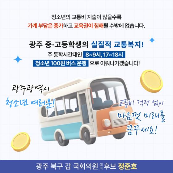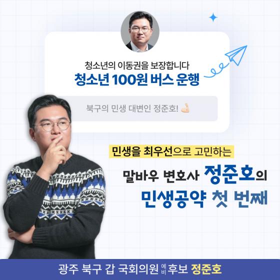 Á¤ÁØÈ£ ´õºÒ¾î¹ÎÁÖ´ç ±¤ÁÖ ºÏ±¸°© ±¹È¸ÀÇ¿ø ¿¹ºñÈ帴 ¡°Ã»¼Ò³âÀ» µÐ °¡Á¤ÀÇ ±³Åëºñ ºÎ´ãÀ» ¹þ¾î³¯ ¼ö ÀÖµµ·Ï Çϰڴ١±°í ´ÙÁüÇÏ¸ç ¡°±¤Áֽà û¼Ò³âµéÀÌ À̵¿ °ÆÁ¤ ¾ø´Â ÀÚÀ¯·Î¿î ¼¼»ó¿¡¼ ¹Ì·¡¸¦ À§ÇØ ¸¶À½²¯ ²ÞÀ» ÆîÄ¥ ¼ö Àֱ⸦ ±â´ëÇÑ´Ù¡± °í µ¡ºÙ¿´´Ù.