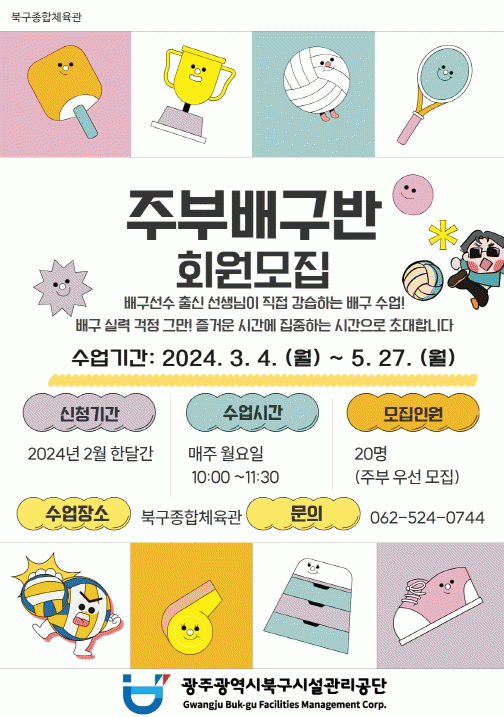 ÁֺΠ¹è±¸±³½ÇÀº 2¿ù ÇÑ´Þ°£ ¼±Âø¼ø 20¸í±îÁö Á¢¼ö ¹Þ´Â´Ù. ¼ö¾÷Àº ºÏ±¸Á¾ÇÕüÀ°°ü¿¡¼ 3¿ùºÎÅÍ 5¿ù±îÁö, ¸ÅÁÖ ¿ù¿äÀÏ ¿ÀÀü 10½ÃºÎÅÍ 11½Ã 30ºÐ±îÁö ÁøÇàÇÑ´Ù. ÀÚ¼¼ÇÑ »çÇ×Àº ºÏ±¸½Ã¼³°ü¸®°ø´Ü ȨÆäÀÌÁö ¾Ë¸²¸¶´ç-°øÁö»çÇ×À» Âü°íÇÏ¿© ½ÅûÇÏ¸é µÈ´Ù.