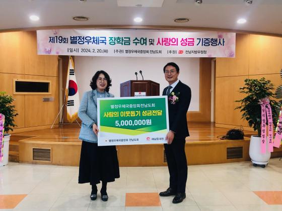 ÀåÇÐ±Ý ¹× »ç¶ûÀÇ ¼º±Ý Àü´Þ½ÄÀº Àü³²Áö¹æ¿ìÁ¤Ã» ¼Ò¼Ó ±¤ÁÖ¡¤Àü³²Áö¿ª 120°³ º°Á¤¿ìü±¹ 600¿© ¸íÀÇ Á÷¿øÀÇ ¸Å³â ²ÙÁØÈ÷ ¸ð±ÝÇÑ ¼º±ÝÀ¸·Î ÀÌ·ïÁ³À¸¸ç Áö±Ý±îÁö ÃÑ 3¾ï 2õ 170¸¸ ¿øÀÇ ¼º±ÝÀ» ±âºÎÇÏ¿© ºÒ°æ±â·Î °íÅë¹Þ´Â Áö¿ª»çȸ¿¡ ÈûÀ» º¸Å¿ԴÙ.