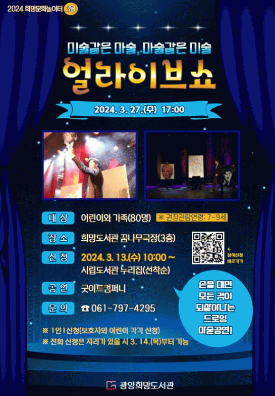 ¡®¾ó¶óÀ̺ê¼î¡¯ °ø¿¬Àº ¾î¸°ÀÌ¿Í °¡Á· ´©±¸³ª °ü¶÷ÇÒ ¼ö ÀÖÀ¸¸ç, Âü¿©¸¦ Èñ¸ÁÇÏ´Â »ç¶÷Àº ¿À´Â 13ÀÏ ¿ÀÀü 10½ÃºÎÅÍ ±¤¾ç½Ã¸³µµ¼°ü ´©¸®Áý¿¡¼ ½ÅûÇÒ ¼ö ÀÖ´Ù.