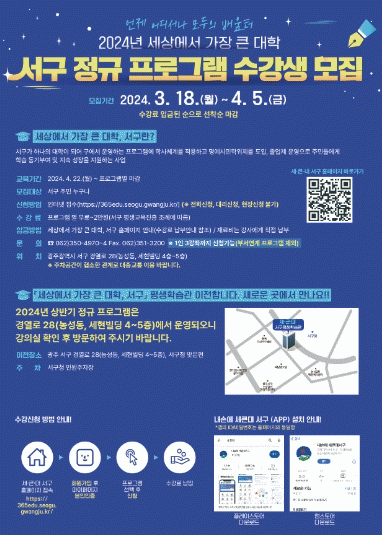 ¿î¿µ ÇÁ·Î±×·¥Àº ¡ã½Ã¹ÎÂü¿©Çаú 10°³ °úÁ¤(¿ì¸®¸¶À»»ýÅÂÇØ¼³»ç ¾ç¼º°úÁ¤ µî) ¡ãÀι®»çȸÇаú 7°³ °úÁ¤(Ä«ÇÁÄ«·Î Àд °¡Á· Àι®ÇÐ, ¼¾çöÇп¡¼ ¹è¿ì´Â »îÀÇ ÁöÇý µî) ¡ã¹®È¿¹¼úÇаú 9°³ °úÁ¤(½Ã´Ï¾î¸ðµ¨, ³» ¼ÕÀ¸·Î ¸¸µå´Â ¼ô ´ÜÆí¿µÈ µî) ¡ãÁֹΰǰÇаú 1°³ °úÁ¤(°È±âÁöµµÀÚ ¾ç¼º°úÁ¤) ¡ãÀü³²´ëÄ¿¹Â´ÏƼÇаú 3°³ °úÁ¤(È£³²ÀÇ ¼Á¤À» Àϱ¸¾î³½ ½ÃÀÎµé µî) ÃÑ 5°³ Çаú 30°³ °ÁÂÀ̸ç, 4¿ù 22ÀϺÎÅÍ »õ·Î ÀÌÀüÇÏ´Â ¼±¸Æò»ýÇнÀ°ü(°æ¿·Î 28, ³ó¼ºµ¿ ¼¼Çöºôµù 4Ãþ~5Ãþ)¿¡¼ ÁøÇàµÈ´Ù.