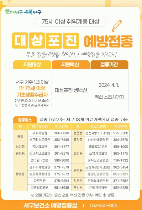 ¿¹¹æÁ¢Á¾ ´ë»óÀÚ´Â ¼±¸¿¡ 1³â ÀÌ»ó ÁÖ¼Ò¸¦ µÐ 75¼¼ ÀÌ»ó ±âÃÊ»ýȰ¼ö±ÞÀÚÀ̸ç Á¢Á¾ ±Ý±âÀÚ ¹× ´ë»óÆ÷Áø Á¢Á¾·ÂÀÌ ÀÖ´Â »ç¶÷Àº Á¦¿ÜµÈ´Ù.