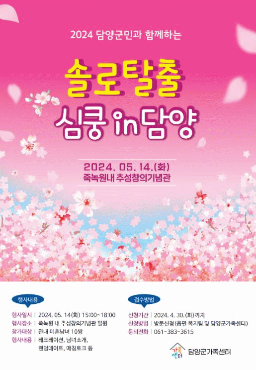 ù¸¸³²ÀÎ ¡®¼Ö·ÎÅ»Ãâ, ½ÉÄô in ´ã¾ç¡¯Àº 5¿ù 14ÀÏ ´ã¾ç ´ë³ª¹« ÃàÁ¦ ±â°£ Áß Á×³ì¿ø ÈĹ® Ãß¼ºÃ¢ÀDZâ³ä°ü ÀÏ¿ø¿¡¼ ÆîÃÄÁú ¿¹Á¤À¸·Î ÇöÀç °ü³» ¹ÌÈ¥³²³à¸¦ ´ë»óÀ¸·Î Âü°¡ÀÚ¸¦ ¸ðÁý ÁßÀÌ´Ù.