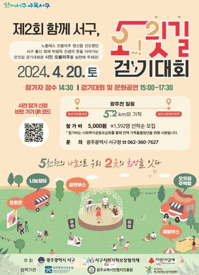 ¡®¿ÀÀÕ±æ °È±â´ëȸ¡¯´Â Âü°¡ºñ ¡®¿Àõ¿ø¡¯³»°í ±¤ÁÖõ µû¶ó 5.2§°¸¦ °ÉÀ¸¸ç ¡®ÀÌ¿ô¡¯µé°ú Èñ¸ÁÀ» ÀÕ´Â Çà»ç·Î Áö³ÇØ Ã³À½ ½ÃÀ۵ƴÙ. ƯÈ÷ ÁֹεéÀÇ ÀÚ¹ßÀûÀÎ Âü¿©¸¦ ÅëÇØ ÀÏ»ó ¼Ó ³ª´®¹®È¸¦ È®»êÇÏ°í °¡Á·µ¹º½Ã»³â(¿µÄɾ)µéÀ» Áö¿øÇÏ´Â µ¥ ±× Àǹ̰¡ ÀÖ´Ù. ¼±¸´Â Áö³ÇØ Ã¹ ¹øÂ° Çà»ç ÈÄ Âü°¡ºñ 600¿© ¸¸¿øÀ» °¡Á·µ¹º½Ã»³â ´ëÇб³ ÀÔÇбÝÀ¸·Î Áö¿øÇÑ ¹Ù ÀÖ´Ù.