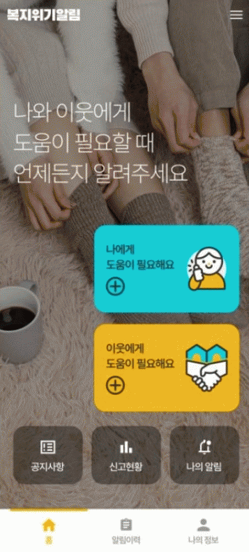 º¹ÁöÀ§±â¾Ë¸² ¾ÛÀº º¸°Çº¹ÁöºÎ¿Í »çȸº¸ÀåÁ¤º¸¿øÀÌ ÁֹεéÀÇ À§±â°¡±¸ ¹ß±¼ ½Å°í¸¦ Ȱ¼ºÈÇϱâ À§ÇØ ¸¸µç °ÍÀ¸·Î ¾ðÁ¦ ¾îµð¼µç º»ÀÎ ¶Ç´Â ÀÌ¿ôÀÇ º¹ÁöÀ§±â »óȲ ¹ß»ý ½Ã ¾ÛÀ» ÅëÇØ ½±°Ô µµ¿òÀ» ûÇÒ ¼ö ÀÖ´Ù.