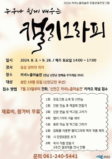 ¿î¿µ ±â°£Àº 8¿ù 3ÀϺÎÅÍ 9¿ù 28ÀϱîÁö ¸ÅÁÖ Åä¿äÀÏ 14½ÃºÎÅÍ 17½Ã±îÁöÀÌ´Ù. Âü°¡ºñ´Â ¹«·áÀ̸ç, ¼ºÀÎ 10¸íÀ» ¸ðÁýÇÑ´Ù. ÇÁ·Î±×·¥ ÁøÇàÀº ½Å¾È±º ½ÅÀǵµ Ãâ½ÅÀ¸·Î ÇöÀç ¸ñÆ÷´ëÇб³ Æò»ý±³À°¿ø¿¡¼ ¼ö¹¬ ͏®±×¶óÇÇ °»ç·Î Ȱ¹ßÇÏ°Ô È°µ¿Çϰí ÀÖ´Â ±è¹Ì´ö ÀÛ°¡°¡ ÁøÇàÇÑ´Ù.
