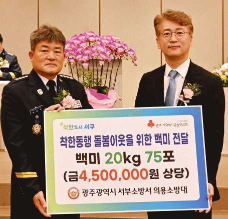 [¹Ìµð¾îÀü³² ±èÁ¤¿ì ±âÀÚ]±èÀ̰ ¼±¸Ã»ÀåÀº 24ÀÏ ¿ÀÀü ±¤ÁÖ ¼ºÎ¼Ò¹æ¼ ÀÇ¿ë¼Ò¹æ´ëÀ¸·ÎºÎÅÍ °ü³» µ¹º½ÀÌ¿ôµéÀ» À§ÇÑ ¹é¹Ì20§¸ 75Æ÷(450¸¸¿ø »ó´ç)À» Àü´Þ¹Þ°í °¨»çÀÇ ¸¶À½À» ÀüÇß´Ù.