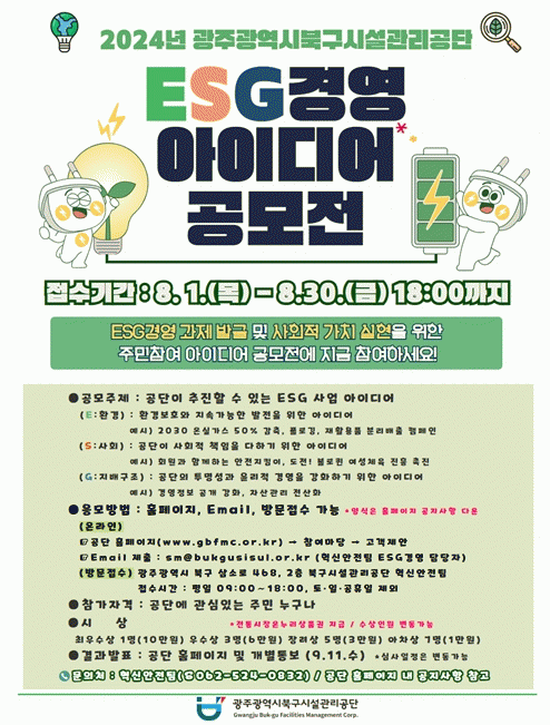 À̹ø °ø¸ðÀüÀº Áö¿ª ÁֹεéÀÇ Ã¢ÀÇÀûÀ̰í Çõ½ÅÀûÀÎ ¾ÆÀ̵ð¾î¸¦ ¹ß±¼ÇÏ¿© °ø´ÜÀÇ ESG°æ¿µ °èȹ¿¡ ¹Ý¿µÇϰí Áö¼Ó °¡´ÉÇÑ ¹ßÀüÀ» µµ¸ðÇϱâ À§ÇØ ¸¶·ÃµÆ´Ù. °ø¸ð ÁÖÁ¦´Â ȯ°æ º¸È£(E), »çȸÀû Ã¥ÀÓ ½ÇÇö(S), Åõ¸íÇÑ °æ¿µ(G) µî °ø´Ü¿¡¼ ½ÇÇö°¡´ÉÇÑ °¢ ºÐ¾ßº° »ç¾÷°úÁ¦ÀÌ´Ù.