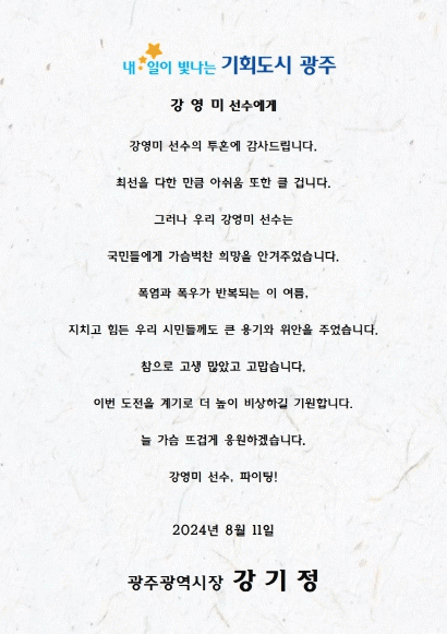 °±âÁ¤ ½ÃÀåÀº À̳¯ ±¤Áֽà ¼Ò¼Ó ¼±¼ö´Ü¿¡ ¡°¿Ã¸²ÇÈ¿¡¼ÀÇ ÅõÈ¥¿¡ °¨»ç¸¦ µå¸°´Ù. ¿Ã¸²ÇÈ¿¡¼ ÃÖ¼±À» ´ÙÇÑ ¸¸Å ¾Æ½¬¿ò ¶ÇÇÑ Å¬ °ÍÀÌ´Ù¡±¸ç ¡°ÇÏÁö¸¸ ¿ì¸® ¼±¼öµéÀº ±¹¹Îµé¿¡°Ô °¡½¿ ¹÷Âù Èñ¸ÁÀ» ¾È°ÜÁÖ¾ú´Ù¡±°í °Ý·ÁÇß´Ù.