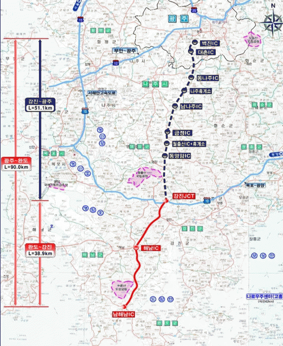 ±¤ÁÖ~¿Ïµµ°£ °í¼Óµµ·Î 2´Ü°è ±¸°£Àº °Áø±º ÀÛõ¸é¿¡¼ ÇØ³²±º ºÏÆò¸é±îÁö 38.9km ±¸°£À¸·Î ±¹ºñ 1Á¶ 5,965¾ï¿øÀÌ ÅõÀԵȴÙ.