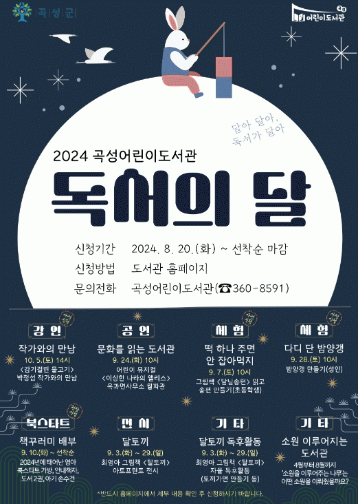 9¿ù 3ÀϺÎÅÍ 29ÀϱîÁö ÃÖ¿µ¾Æ ÀÛ°¡ÀÇ ±×¸²Ã¥ ¡®´ÞÅä³¢¡¯ÀÇ ¾ÆÆ®ÇÁ¸°Æ® Àü½Ã¿Í Åä³¢ °¡¸é ¸¸µé±â µî ÀÚÀ² µ¶ÈÄȰµ¿ÀÌ ÁøÇàµÇ°í, 9¿ù 7ÀÏ¿¡´Â ÃʵîÇлýÀ» ´ë»óÀ¸·Î ±×¸²Ã¥ ¡®´Þ´Ô¼ÛÆí¡¯À» ÀÐ°í ¼ÛÆí¸¸µé±â üÇèÇà»ç¸¦ ÁøÇàÇÑ´Ù.