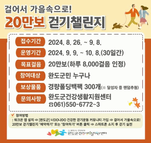縰Áö´Â 9¿ù 9ÀϺÎÅÍ 10¿ù 8ÀϱîÁö 30Àϰ£ ÁøÇàµÇ¸ç, ±â°£ ³» 20¸¸ º¸ °È±â(ÇÏ·ç 8,000º¸ ÀÎÁ¤)¸¦ ´Þ¼ºÇÏ¸é µÈ´Ù.