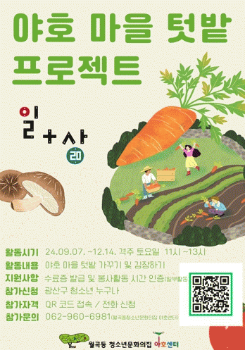 ÇÁ·Î±×·¥Àº 9¿ù 7ÀϺÎÅÍ 12¿ù 14ÀϱîÁö Åä¿äÀÏ °ÝÁÖ·Î ÁøÇàµÇ´Â ÇÁ·Î±×·¥À̸ç, û¼Ò³âµéÀÌ Á÷Á¢ °èÀýº° ÀÛ¹°À» ½É°í ¼öÈ®ÇÏ¸ç µµ½Ã³ó¾÷ Àü¹®°¡¿Í ÇÔ²² µµ½Ã ³ó¾÷¿¡ ´ëÇØ Àü¹®ÀûÀÎ ±³À°À» ¹ÞÀ» ¼ö ÀÖ´Ù.