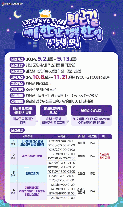 ÇÁ·Î±×·¥Àº ´ÙÀ°ÀÌ Å׶󸮿ò ¹× ¸ð½ºÀ̳¢ ȺР¸¸µé±â, AI¿Í êGPT Ȱ¿ë, ¹ÎÈ ±×¸®±â, À̹ÌÁö¸ÞÀÌÅ· µî 4°³ °úÁ¤À» ¿î¿µÇÑ´Ù. ÇÑ °Á ´ç 15¸í¾¿ ¼±Âø¼øÀ¸·Î ¸ðÁýÇϸç, ¼ö°·á¿Í Àç·áºñ´Â ¹«·áÀÌ´Ù.